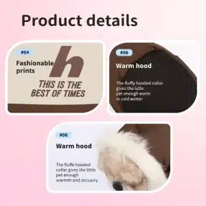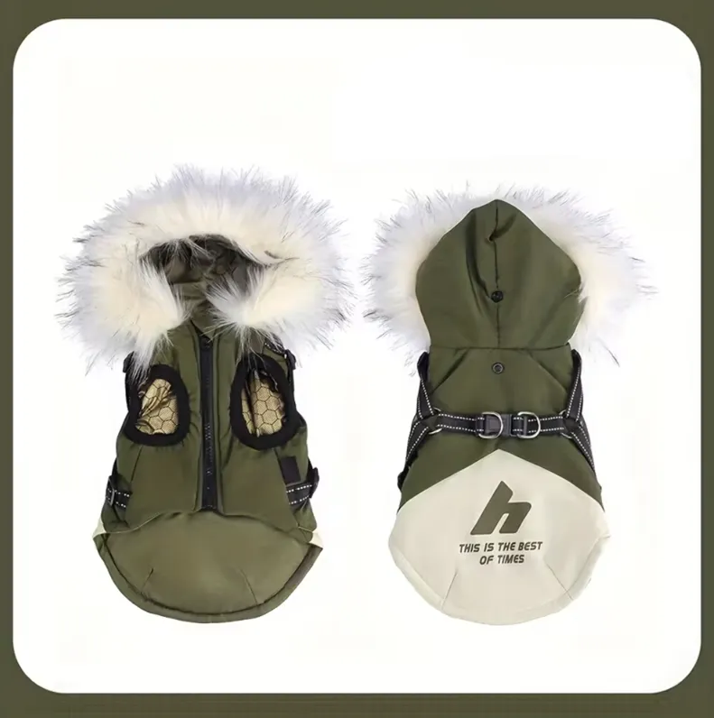 Bunda má elegantní kožešinovou kapuci, zapínání na zip a pevné kovové háčky, na které můžete přímo připnout vodítko.
