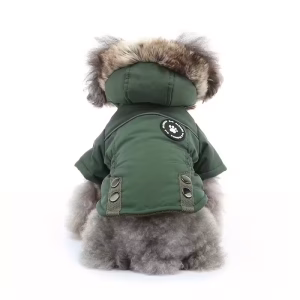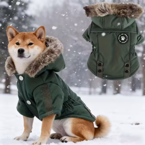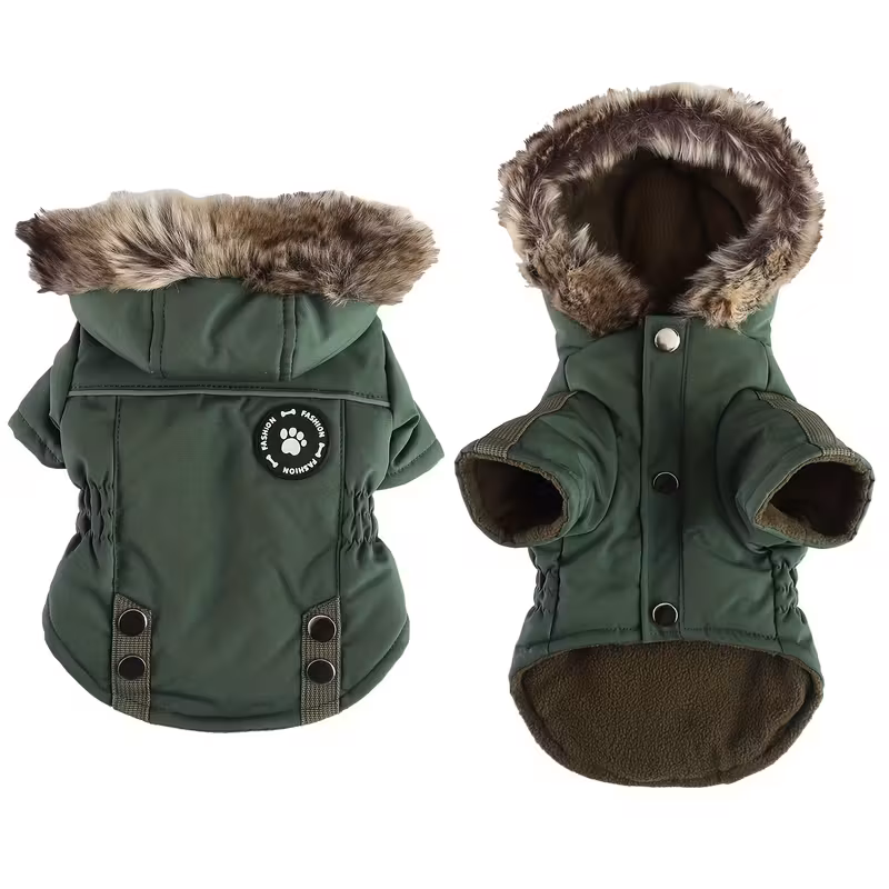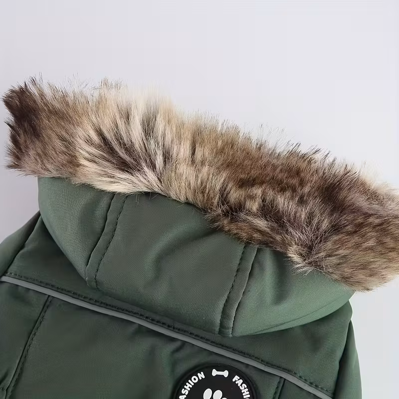 Zimní teplý kabát pro psy s kapucí a kožešinou – větruodolný